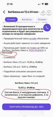 Здравствуйте! Покупали в Могилеве 26.11.2025 по акции сет за 10,90р. В акции указано, что держатель купона получит скидку на сет "БигБокс Микс (12 шт) Состав бокса: 4 напудренных пончика, 4 начиненных, 2 со вкусом рафаэлло, 2 со вкусом сникерс", но по факту нам выдали сет "БигБокс (12шт) Состав бокса: 3 глазированных, 3 глазированных с посыпкой, 6 напудренных".