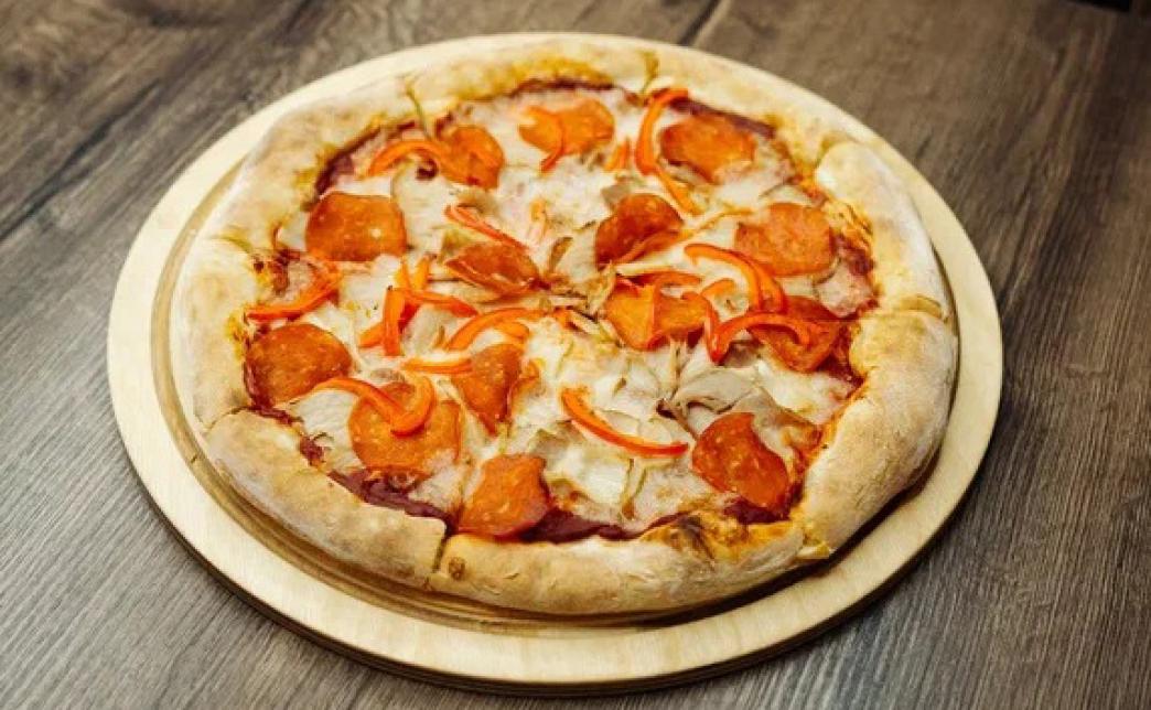 Состав: томатный соус, моцарелла, карбонад, бекон, пепперони, перец болгарский