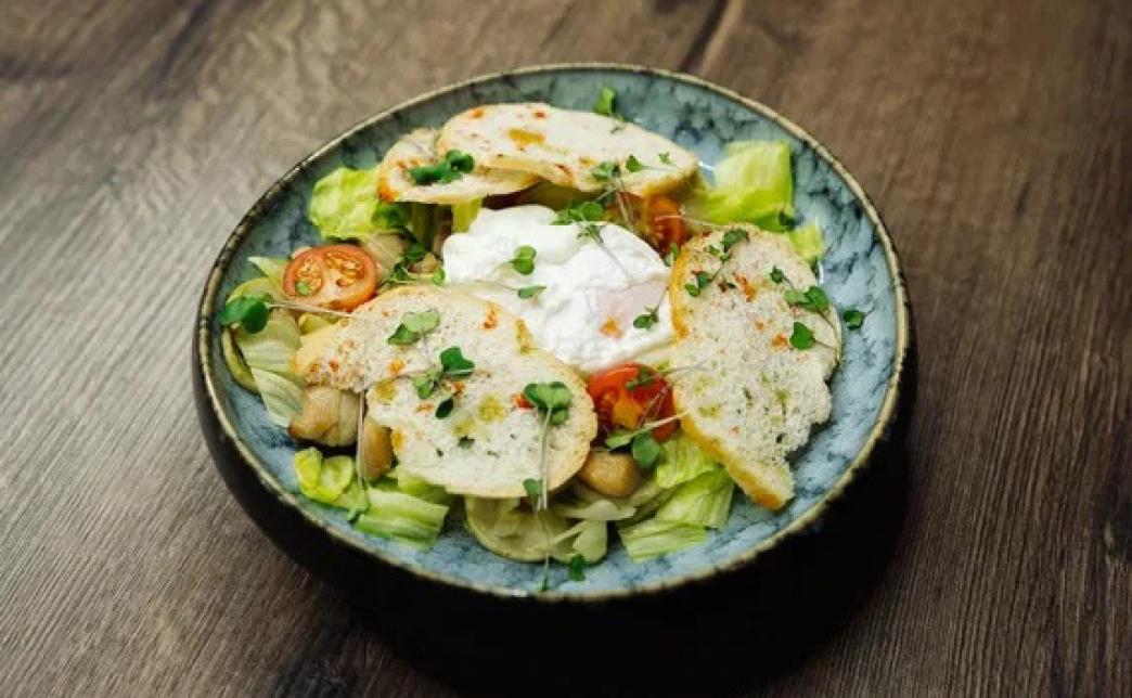 Состав: цукини, мякоть бедра, черри, яйцо, салат, чеснок, соус цезарь, крутоны