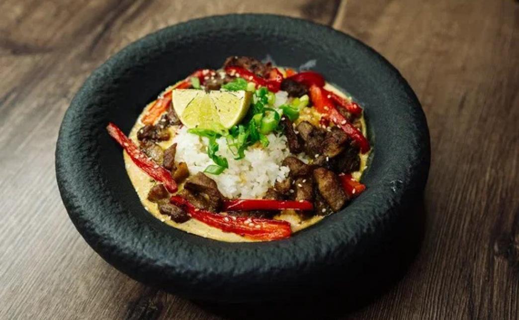Состав: рис, соус карри, сливки, свиная вырезка, перец болгарский, зеленый лук, кунжут