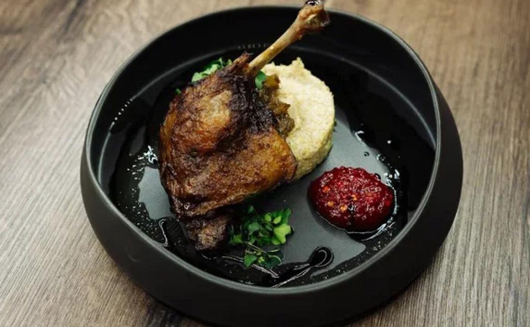Состав: киноа, сливки, чеснок, чатни из яблок, утиная грудка конфи, петрушка