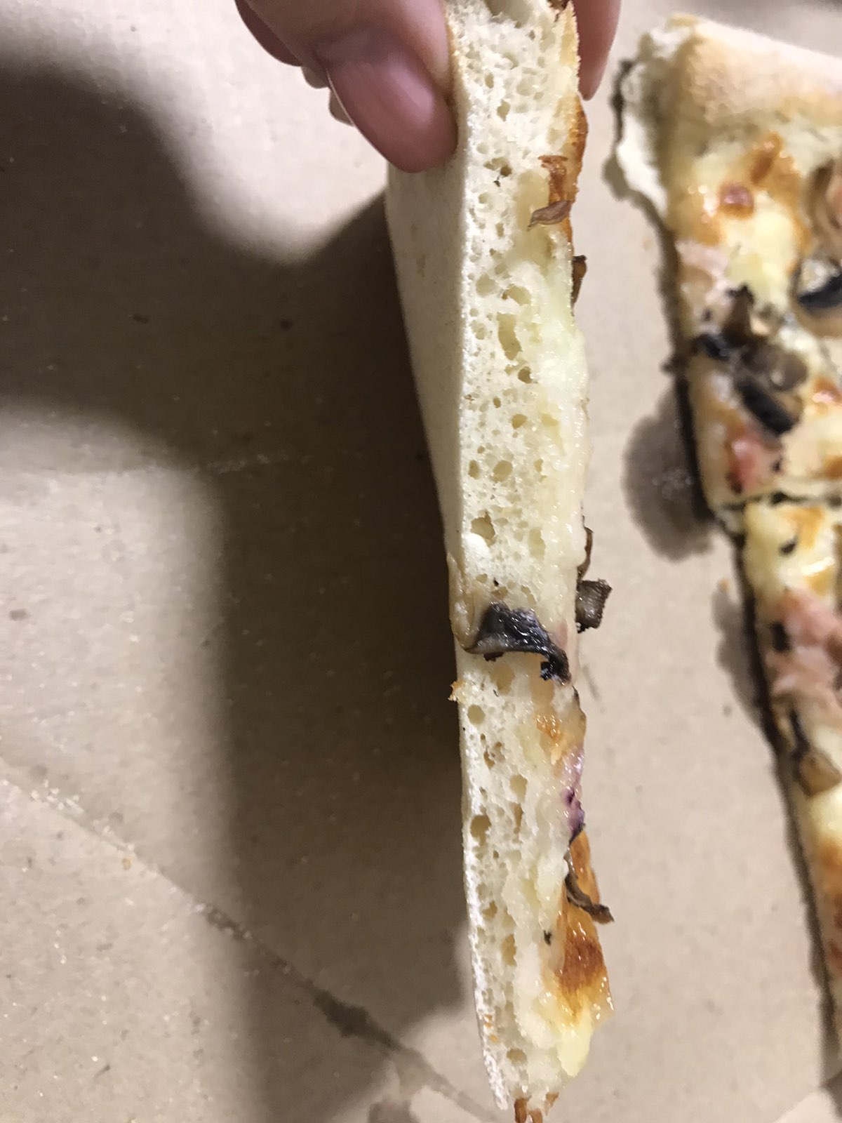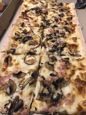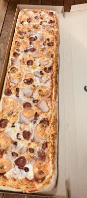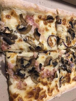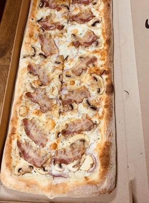 Белый соус, сыр "Моцарелла", грибы, бекон, лук, орегано, базилик.