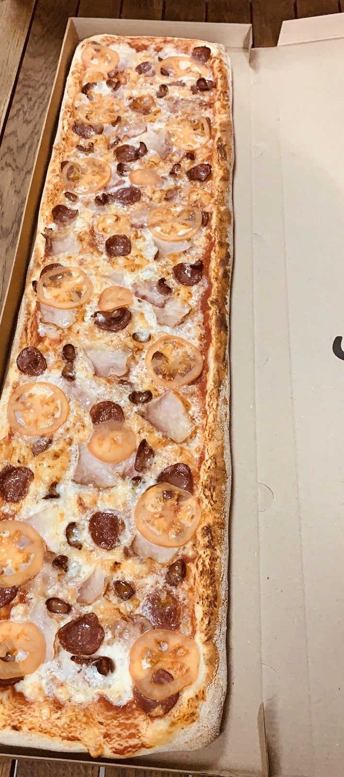 Соус красный, сыр "Моцарелла", салями, бекон, колбаски "Охотничьи", ветчина, помидор, орегано.