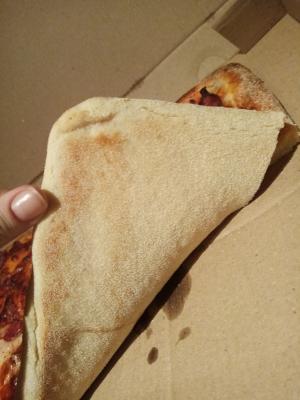 Соус красный, сыр "Моцарелла", салями, бекон, колбаски "Охотничьи", лук репчатый, перец чили и орегано.
