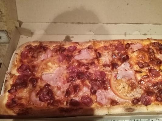 Соус красный, сыр "Моцарелла", салями, бекон, колбаски "Охотничьи", ветчина, помидор, орегано.